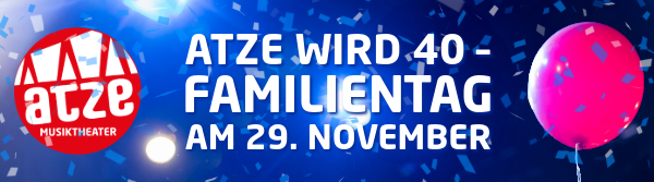Das ATZE Musiktheater wird in diesem Jahr 40 Jahre – und das wollen wir zusammen mit euch feiern! Am 29. November 2025 laden wir euch zum großen Familientag ins ATZE Musiktheater ein – der Eintritt ist kostenlos!